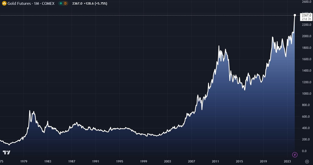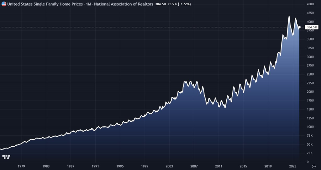 Aujourd'hui, les maisons (en moyenne!) valent autour de 400K$ USD aux États Unis. L'or est à 2300$.
