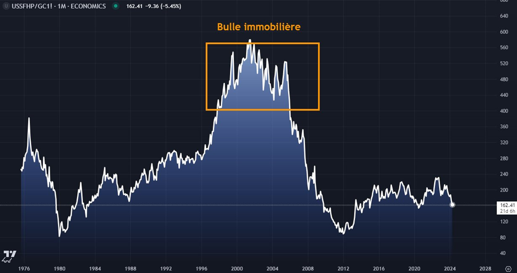 En fait, si je divise les indices de prix des maisons par le cours de l'or... on voit bien la bulle immobilière des années 2000 ou à un certain moment donné il fallait près de 600 onces d'or pour acheter une maison.