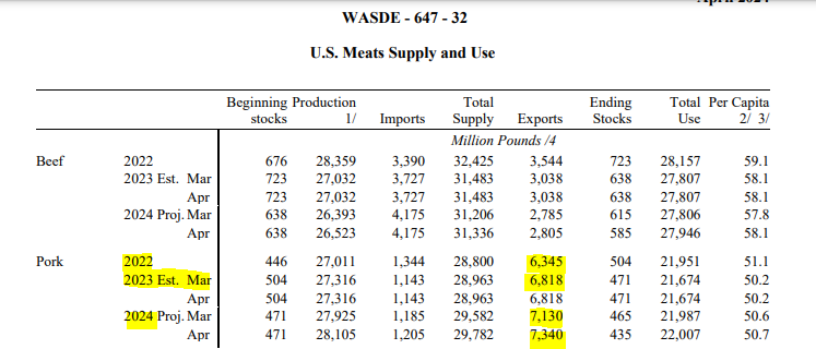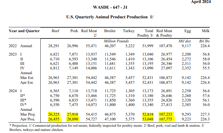 Le USDA est venu lancer un pavé dans la mare hier avec la publication de son rapport de grain. Ne vous inquiétez pas, les inventaires de grains demeurent très élevés et les prix auront besoin d’une grande frousse cet été pour remonter. La partie viande était, pour moi, un peu plus préoccupante. Le USDA relève la production de porc, bœuf et poulet dans ce rapport. Mais étrangement, l’organisme a relevé aussi ses prévisions de prix moyen pour toutes les espèces de 2 cents / livre en 2024.