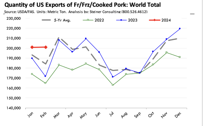 En parlant des exportations, le USDA a rapporté que les États-Unis avaient vendu encore 47 400 tonnes métrique de porc la semaine dernière. C’est beaucoup! Mexique, Corée du Sud et Chine occupent les premières places du palmarès. Le USDA a modifié ses attentes au niveau des exportations en les haussant de 210 millions de livres. Ainsi toute la production supplémentaire prévue (+180 millions) dans ce rapport irait à l’exportation. Si les chiffres sont atteints, la hausse serait de 7.65% versus 2023. La cadence pour les 4 premiers mois de 2024 est de +11% On s’attend donc à un léger ralentissement dans la 2ieme moitié de 2024. Les analystes pensent que cela n’arrivera pas. Ils pensent même que les choses s’accéléreront. Je pense que plusieurs pays achètent présentement en prévision des élections américaines en novembre prochain. Et dans tous les cas c’est une situation perdante pour le porc. Si Trump reprend le pouvoir, il est certain que des mesures aux frontières seront imposées. Si Biden demeure Président, les acheteurs auront déjà acheté et les congélos seront déjà pleins! Une situation à faire attention pour la fin 2024 et le début de 2025.