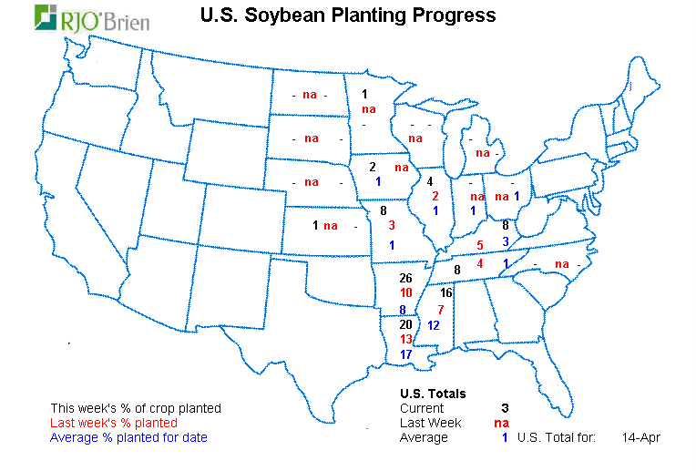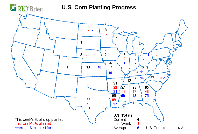 La saison est lancée. Les cartes et tableaux au bas. Évidemment c’est un début et plus on va au sud des USA, plus c’est avancé. Même s’il n’y a pas beaucoup de maïs en Louisiane, il est semé à 95%. J’imagine que ça va vite quand tu n’as pas d’hiver et que tu n’as pas très grand à semer. M’enfin. Pour les curieux, en Louisiane, ils sèment environ 500 milles acres. À peu près deux fois moins qu’ici au Québec. Je fais une moyenne, très arrondie. Au Texas – everything is bigger in Texas – ils sèment environ 2 million d’acres et ils sont à 63%. Anyways, tout ça pour dire que ça commence à semer, et la progression se fait du Sud vers le Nord. Les gros états du Midwest comme l’Iowa et l’Illinois ou respectivement c’est 11 et 13 million d’acres de maïs sont habituellement plus semé au début du mois de mai. Donc d’ici là ça progresse bien, mais à vrai dire ça va s’accélérer dans les prochaines semaines.