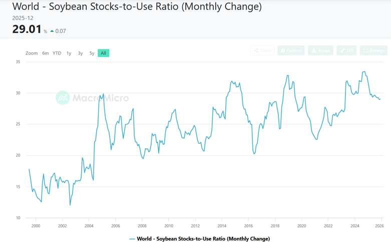 En absolu, les inventaires sont élevés avec 107 millions de tonnes, mais la consommation vient masquer la réalité de l’abondance avec à peine un ratio de 11% (excluant les données chinoises). Et la situation pourrait se dégrader avec une baisse des rendements aux Etats-Unis dans 3 semaines (rapport final du USDA pour 2025). Et ce n’est pas les producteurs sud-américains qui combleront le manque à gagner.