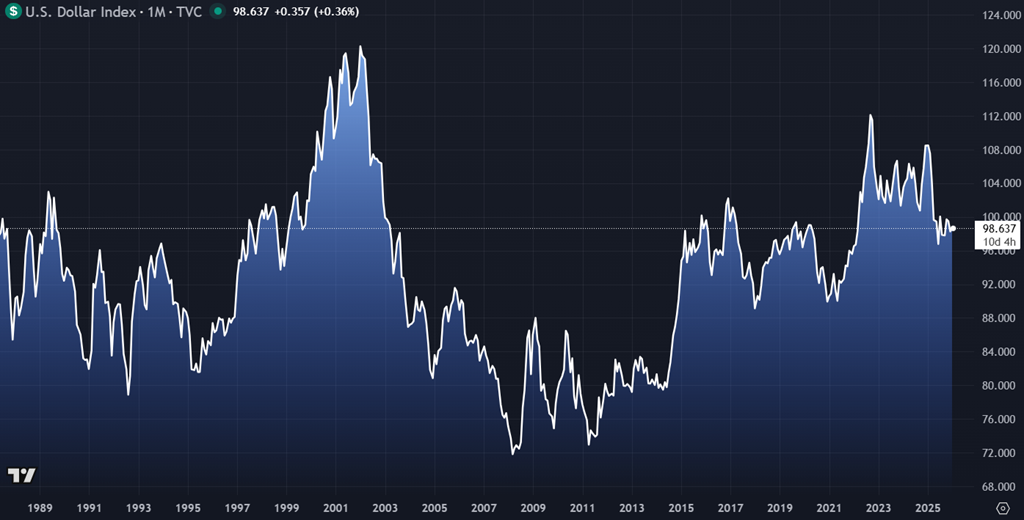 Tout cela vient aussi jouer sur la valeur du dollar américain, mais d’autres facteurs influencent le billet vert, au-delà du marché obligataire. Primo, La Fed a cessé d’être le moteur : les hausses du taux directeur sont terminées et le marché anticipe des baisses de taux. Deuxièmement, les autres banques centrales ont rattrapé leur retard : L’Europe et le Japon ne sont plus les “maillons faibles” des taux d’intérêt ultra-faible. Troisièmement les États-Unis ont déficit budgétaire massif, le monde absorbe énormément de dette US… mais diversifie davantage et n’a plus besoin d’accumuler autant de USD qu’avant. Quatrièmement la dé-dollarisation (marginale, mais réelle) ; ne n’est pas la fin du dollar, mais plus de commerce bilatéral hors USD et plus de réserves en or. J’ajouterais que le dollar américain était possiblement surévalué (COVID, Ukraine, etc…). Le dollar était cher, mais ce que je vois depuis un an se rapproche plus d’une normalisation, pas un effondrement. (annexe 6)