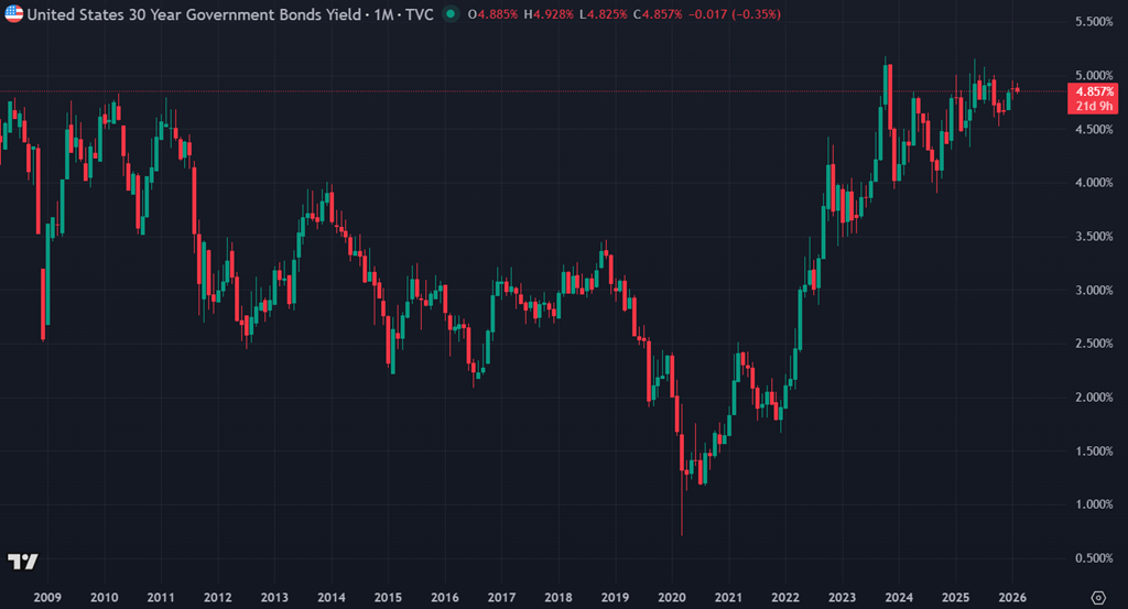 Pendant ce temps, les taux d’intérêt à long terme demeurent élevés. Même si la Fed a maintenu ses taux directeurs inchangés lors de la dernière réunion, c’est le marché obligataire qui fixe le coût du capital. Le Trésor américain à 10 ans se situe toujours autour de 4 %+, et le 30 ans près de 5 %. Cela indique que le marché reste préoccupé par la persistance de l’inflation, les déficits budgétaires et l’ampleur des émissions de dette (voir graphiques 1 et 2 ci-dessous).