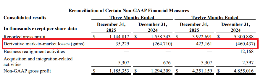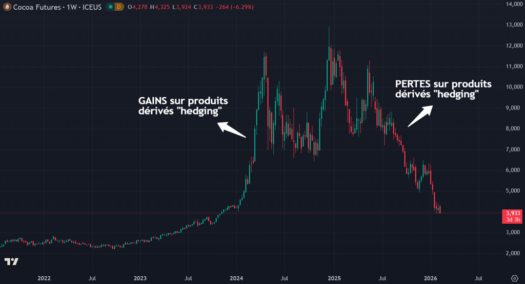 Hershey a ainsi enregistré des gains sur dérivés en 2024 alors que le cacao s’envolait, puis des pertes sur dérivés en 2025 à mesure que les prix se corrigeaient — une inversion comptable normale pour une entreprise qui utilise des couvertures afin de lisser la volatilité des matières premières, plutôt que pour spéculer.
