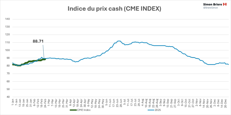 Ce qui voudrait signifier que les prix devraient baisser? Pas tout à fait, le USDA prétend, dans une autre publication en février, que les exportations américaines devraient croitre aussi de 2% en 2026. (après une baisse de 2,6% en 2025 versus 2024).