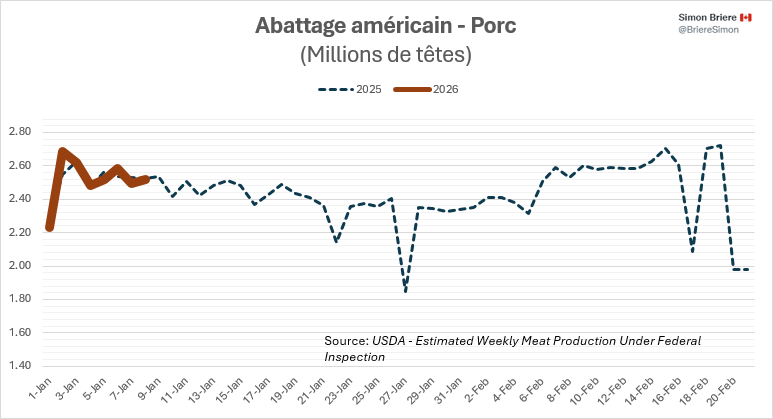 Si on tient compte des abattages? On peut difficilement différencier 2026 de 2025. Nous semblons avoir moins de porcs pour l’instant (1 jour d ‘abattage en moins en 2026). Mais des poids supérieurs, donc une quantité de viandes produite légèrement sous 2025. Mais tout juste par un cheveu.