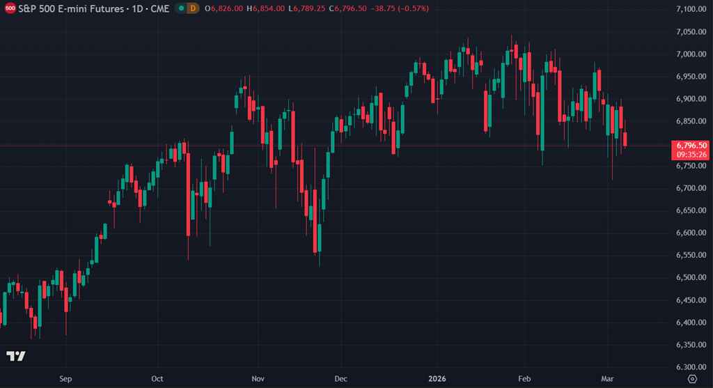 Les marchés boursiers réagissent négativement à cette nouvelle hausse du pétrole et à l’incertitude géopolitique. Les contrats à terme sur le S&P 500 se situent autour de 6797, en baisse d’environ 0,6 %, tandis que le Nasdaq recule d’environ 0,7 % et le Dow Jones d’environ 0,5 %. Pour l’instant, il s’agit davantage d’un mouvement de prudence et d’aversion au risque qu’une liquidation généralisée.