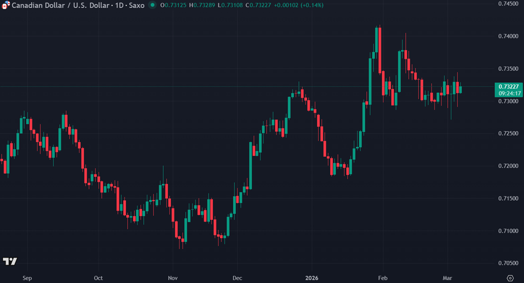 Le dollar canadien recule légèrement autour de 0,732, malgré la forte hausse du pétrole, ce qui reflète surtout un environnement global plus « risk-off » où le dollar américain demeure recherché.