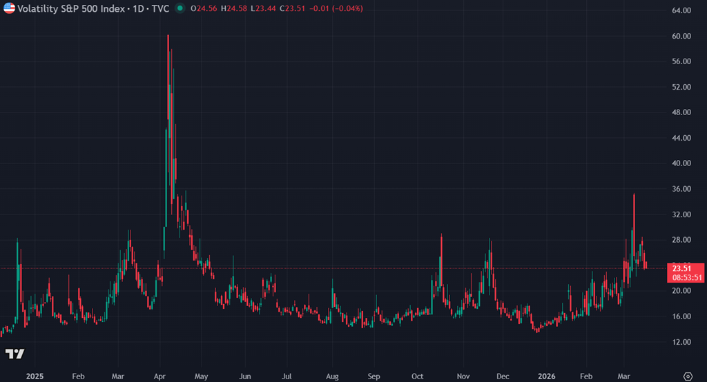 La volatilité demeure élevée mais stable, avec un VIX autour de 23, ce qui traduit un marché encore nerveux mais loin d’un stress systémique immédiat.