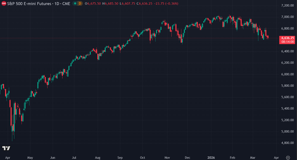 Les futures sur le SP500 reculent vers 6644, en baisse d’environ 0,2 %. Le Nasdaq cède près de 0,4 % et le Russell demeure fragile. Le marché consolide surtout l’impact combiné d’un choc énergétique et du message prudent des banques centrales cette semaine. Les taux obligataires restent élevés, ce qui limite l’appétit pour le risque. On observe davantage des repositionnements techniques qu’un mouvement directionnel clair.