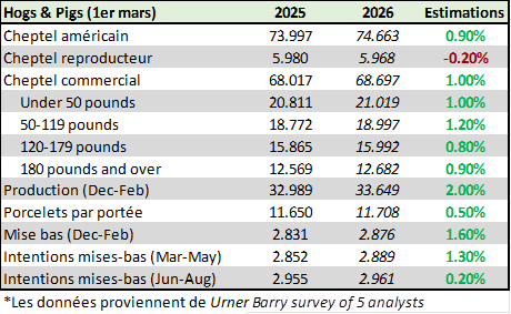 Du côté du cheptel commercial, une hausse d’environ 1 % est anticipée, avec des augmentations dans toutes les catégories de poids. Autrement dit, le pipeline semble légèrement plus rempli à chaque étape de production, ce qui appuie l’idée d’une production porcine plus élevée plus tard en 2026.