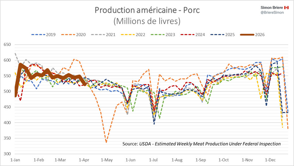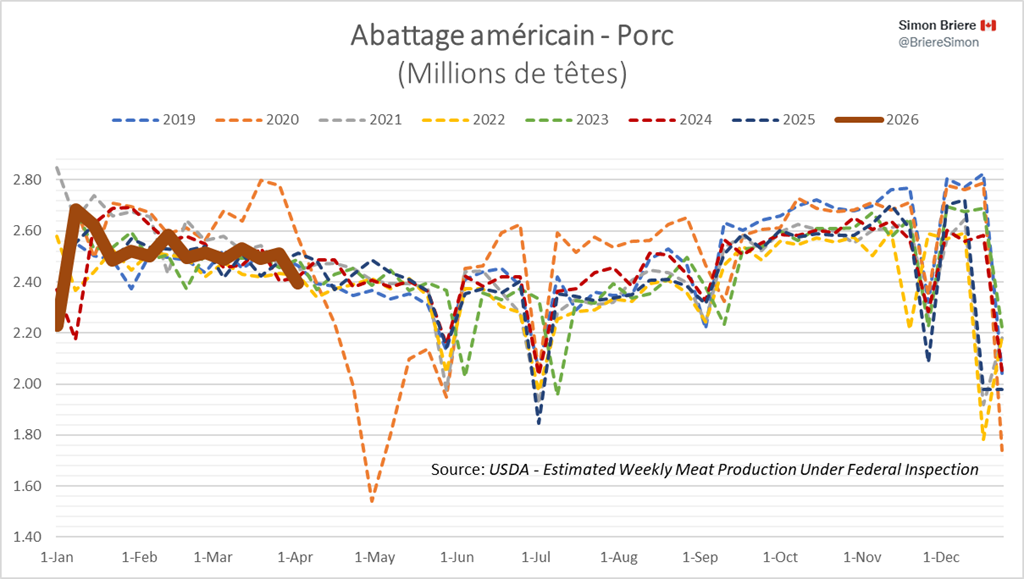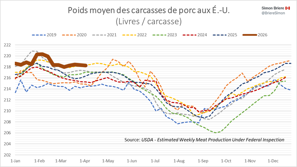 Les abattages américains sont en baisse d’environ -1.2% YTD, donc il y a effectivement un peu moins de têtes qui passent, mais le poids moyen des carcasses demeure au-dessus de l’an passé, ce qui vient compenser une bonne partie du recul.