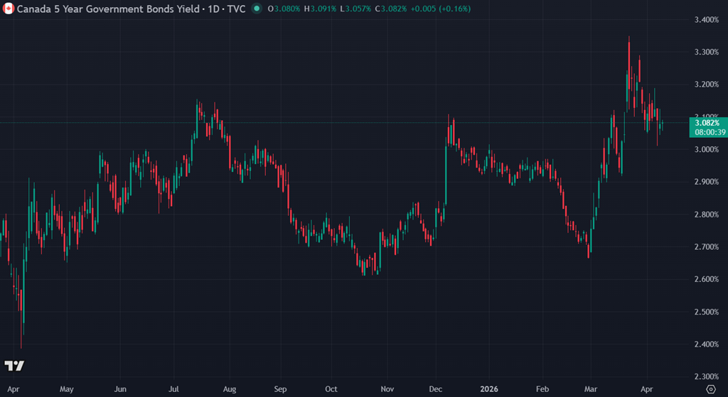 Le marché obligataire ne réagit pas fortement ce matin, mais l’absence de mouvement est en soi un message. Le 5 ans Canada reste autour de 3.08 % (vs 2.70% avant la guerre), ce qui suggère que le rapport d’emploi, sans être spectaculaire, n’a rien donné à la Banque du Canada pour justifier des baisses rapides de taux. Avec des salaires en hausse de 5.1 % et un pétrole encore élevé, le marché conserve une petite prime d’inflation dans la courbe.