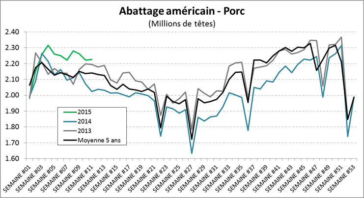 Abattage de porc de 2.25M têtes, +10% de plus que l’an dernier mais seulement +1.5% qu’en 2013