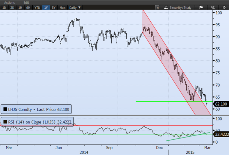 On dirait que le vendredi 13 a fait peur au prix des matières agricoles puisque tout a baissé aujourd’hui. Le prix des grains a connu une fin de semaine difficile avec de faibles ventes à l’exportation en plus d’une appréciation du dollar américain et de la progression de la récolte en Amérique du Sud. Du côté des viandes, la production reste élevée dans le porc et on connait toujours un déficit dans le bœuf gras. Pour la production de porc, elle demeure inchangée par rapport la semaine dernière à 477 millions de livres ce qui est 10.4% de plus qu’en 2014. Le poids des carcasses est sur une pente descendante contrairement à l’an dernier, mais reste relativement élevée, toujours au-dessus de 214 lbs/carcasse (graphique 1). Les abattages semblent astronomique à +10% du volume de l’an dernier, mais nous commencerons à comparer de plus en plus avec l’année 2013 qui est une meilleure référence dont le volume était seulement 1.5% inférieur à cette semaine (graphique 2). Dans le bœuf, la production était particulièrement faible à 439M livres, influencée négativement par des abattages en baisse de 8.7% par rapport l’an dernier.
