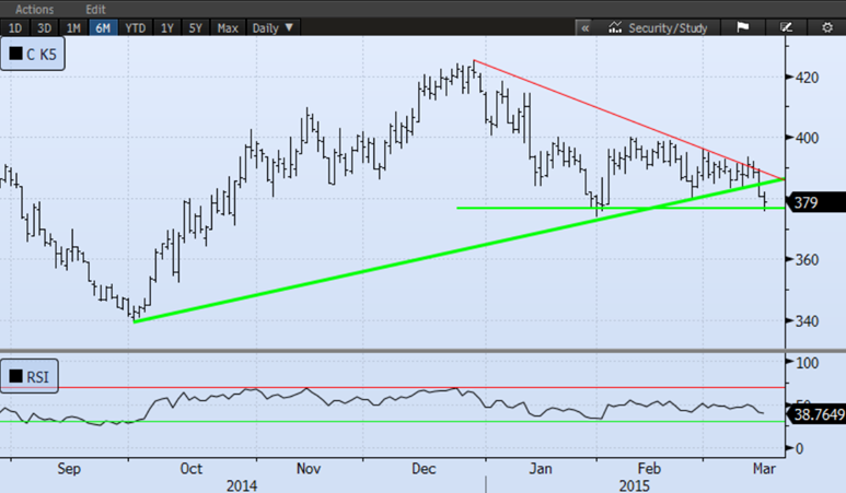 Maïs de mai (¢US/boisseau) = Neutre / négatif