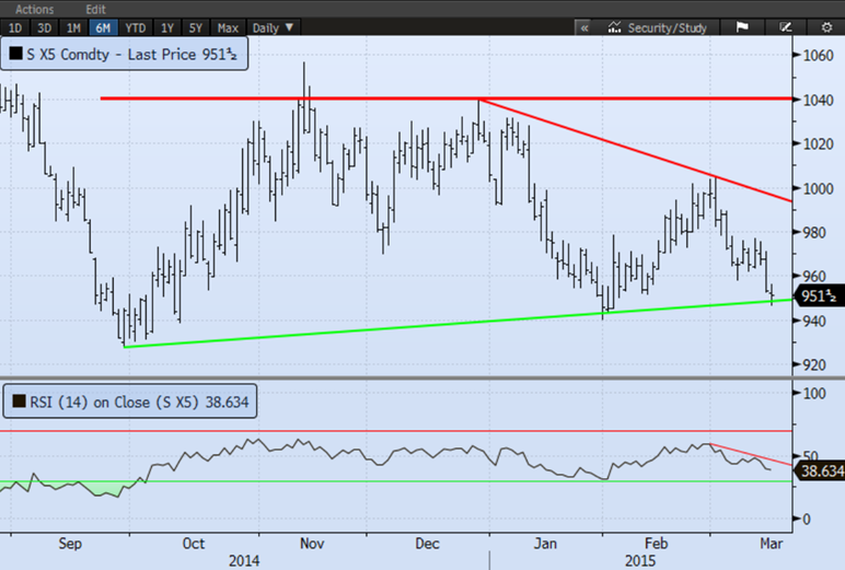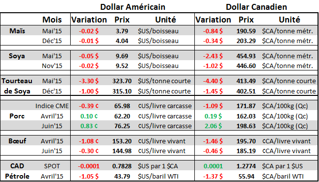 - Trituration de soya en février: 146.97 millions de boisseaux, 3.8% de plus qu’en février 2014 mais sous les estimés