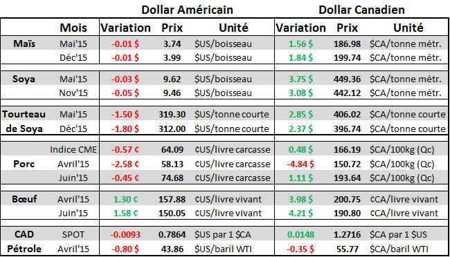 Malgré l’annonce de la Réserve Fédérale Américaine qui mettait en garde les investisseurs trop confiant sur l’économie américaine, le billet vert a repris de la force aujourd’hui. Le dollar canadien est retourné dans les bas à 78.60 après s’être apprécié jusqu’à 80.32 en fin d’après-midi hier. Le retour en force du dollar américain impacte négativement les prix des matières premières se faisant grandement ressentir sur le prix du porc, en baisse de 2.5 ¢/lb.