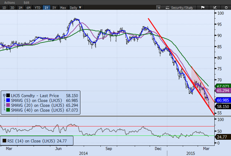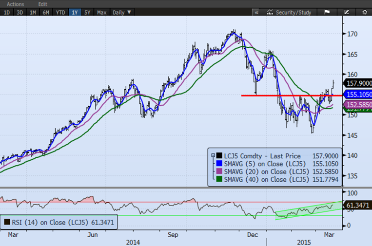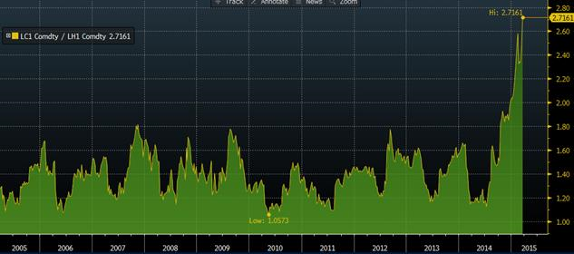 À 58¢/lb pour les livraisons d’avril, le marché s’attend à une continuation des volumes d’abattage de porc qui dépassent 2.2 M têtes par semaine. Encore cette semaine, nous sommes à la même quantité de bêtes abattues que la semaine dernière contrairement à la saisonnalité des abattages où le volume devrait diminuer de semaine en semaine. Pendant que le prix des carcasses chute, le prix des découpes se maintient au même niveau depuis 3 semaines, au bonheur des abattoirs qui voient leur marge de profit exploser. Jusqu’à maintenant, 2015 est une année très payante avec une marge opérationnelle moyenne de 16$/tête chez les abattoirs. Par ailleurs, le ratio entre le prix du porc et du bœuf a atteint un sommet historique à 2.7, signifiant que le prix du bœuf vivant est 2.7 fois le prix de la carcasse de porc, c’est du jamais vu (graphique 1). Au niveau actuel, les inséminations de porc fonctionnent probablement au ralenti ce qui devrait être positif pour les prix de la fin 2015, le ratio entre le prix du bœuf et porc pourrait rester à des niveaux extrêmes pendant un certain temps, mais un réajustement est probable. Sur les prix de décembre 2015, le ratio est à 2.40 ce qui historiquement très élevé. Bien que j’attendrais de voir un renversement du ratio avant d’entreprendre une position, ce ratio peut se transiger en achetant 5 contrats de porc et vendre 2 contrats de bœuf (décembre 2015) pour une valeur d’environ 120 000 $US par type de viande.
