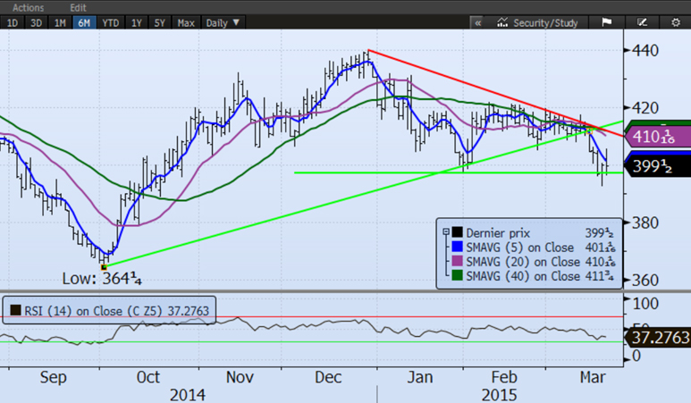Maïs de déc'15 (¢US/boisseau) = Négatif