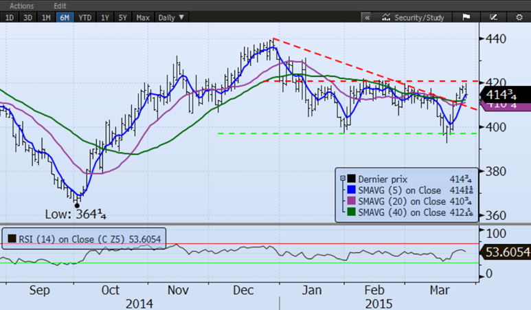 Maïs de déc'15 (¢US/boisseau) = Neutre / positif