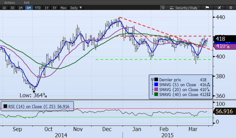 Maïs de déc'15 (¢US/boisseau) = Neutre / positif