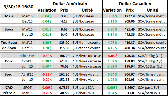 Autant dans le maïs, les blés et la fève soya, on s’attend à ce que les inventaires au 1er mars soient supérieur à ce qu’ils étaient l’an dernier. La plus importante variation est l’augmentation de 35% des réserves de fève comparativement à 2014. Pour les 2 autres grains, on s’attend à une augmentation d’environ 8% en raison de l’énorme récolte l’été dernier. Puisque les inventaires sont à des niveaux élevés en Amérique du Nord, le Canada ne renouvèlera probablement pas la législation mise en place l’an dernier afin d’assurer un minimum de grains livré dans les déplacements ferroviaires. Cette législation expirera ce samedi.