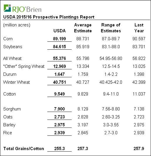 Comme tout le monde s’attendait, les américains vont planter plus de soya et moins de maïs selon le sondage de l’USDA, mais l’amplitude du changement sera moindre qu’anticipé ce qui concorde avec la récente diminution du ratio soya/maïs. Le résultat du rapport est ci-dessous, dans les tableaux 1 et 2. Les grands perdants au niveau des superficies sont le blé d’hiver, le coton et le maïs. Les gagnants sont le soya et le sorgho. Somme toute, la superficie de toutes les cultures réunies totalise 255.3M acres, soit 2.6M de moins que l’an dernier.