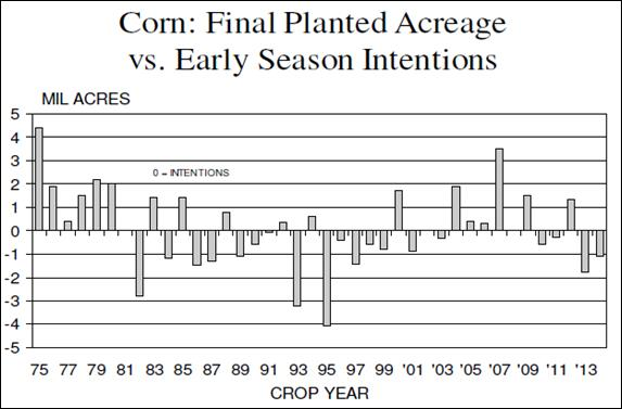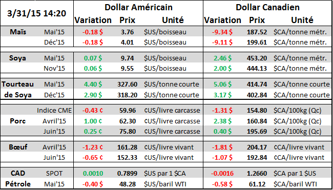 Le rapport du l’USDA est négatif pour le prix puisqu’il y a plus d’inventaires et de superficies qu’anticipés. Les producteurs prévoient planter 89.2M acres cette année ce qui 1.4M de moins que l’an dernier. Les superficies perdues sont principalement dans le cornbelt (à l’exception du Minnesota) et en Dakota du Sud. Durant la dernière décennie, la superficie réellement plantée est normalement 1 million acres plus ou moins à ce qui avait été sondée au mois de mars (tableau 3). Au 1er mars 2015, il y avait 7.744 milliards de boisseaux en inventaire ce qui était plus que prévus. Les producteurs détiennent 57% des inventaires ce qui est la même proportion que l’an dernier. Ces inventaires plus élevés pourraient se refléter par des inventaires de début d’année 2015/16 plus élevés, en plus des superficies plus fortes que prévues. Même avec la baisse d’aujourd’hui, nous restons au-dessus du support à 4.00$/boisseau pour la prochaine récolte, mais il faudra rester attentif puisqu’il y a un risque si nous cassons ce niveau.