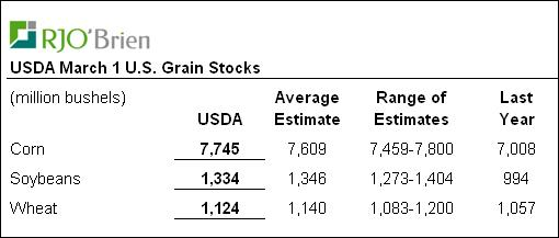 Le rapport est neutre pour le prix du blé, ce qui n’a pas empêché le prix de chuter de 20¢/boisseau, probablement en raison de la baisse du prix du maïs. À travers les classes de blé, on note que les superficies de blé de printemps sont moindre qu’anticipé à 13M acres, alors que les superficies des blés d’hiver sont légèrement plus élevées que le rapport du 10 janvier. Les inventaires sont plutôt en ligne avec les estimés à 1.12M boisseaux.