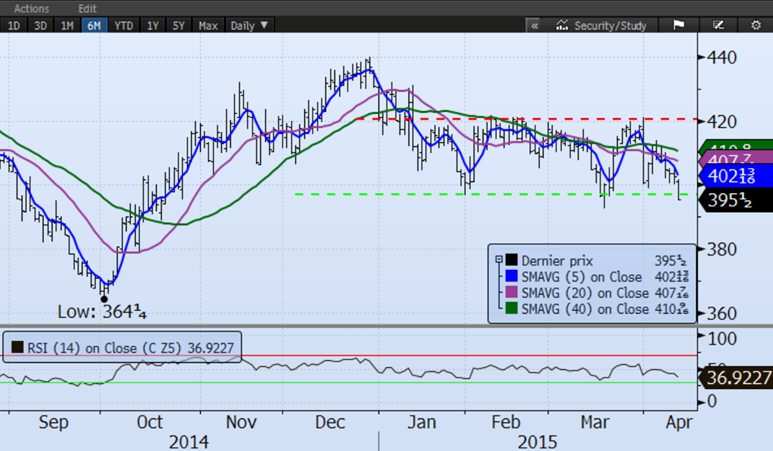 Maïs de déc'15 (¢US/boisseau) = Neutre / potentiellement négatif