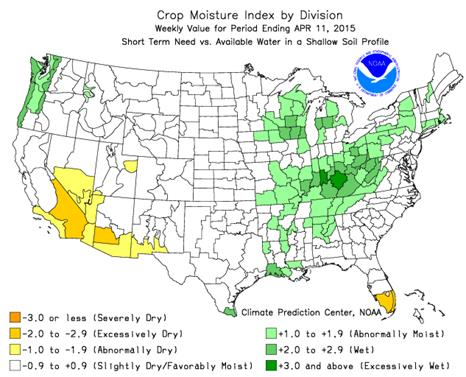 Les ensemencements de maïs ont débuté la semaine dernier au Kansas, en Caroline du Nord et au Texas, pour un total de 2% des superficies américaines. Rien n’a commencé dans le Cornbelt et on est derrière la moyenne 5 ans (5%), mais c’est facilement rattrapable. Cependant, les 3 états cités précédemment pourraient ralentir la cadence en raison des précipitations pour la prochaine semaine, où on prévoit jusqu’à 23cm de pluie. Les sols sont déjà humides (graphique 2) et il sera important de suivre les précipitations des prochaines semaines puisqu’on pourrait accumuler du retard s’il y a trop d’eau. La proportion du Topsoil américain en surplus d’eau est à 24%, comparativement à 21% la semaine dernière et 13% en 2014. La météo était assez clémente la semaine dernière au sud des prairies canadiennes, permettant une bonne progression des ensemencements de blé de printemps (blé de Minneapolis). Il y a 17% des sols d’ensemencés en date du 12 avril comparativement à 11% en moyenne.