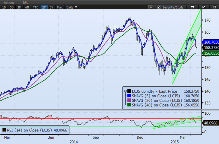 Maintenant à la mi-avril… la météo fait son entrée sur le tapis rouge comme joueur étoile pour les prochains mois, il deviendra un facteur déterminant pour les prix des grains. Pendant que les blés d’hiver émergent du sol, les précipitations du weekend dernier et des prochains jours (graphique 1) ont causé du tort à Chicago. De plus, on parle de plus en plus que la Russie pourrait enlever la restriction sur ses exportations de blé, augmentant l’offre mondial si cela arrive. Ouvrant à la baisse d’une dizaine de cents, le prix du blé d’hiver a fini la journée avec une baisse de plus que 4%, reposant actuellement sur son support technique. Il faut dire qu’actuellement, les prix des grains repose sur une lame de rasoir : le prix du blé, du maïs et du soya pour la prochaine récolte sont tous sur leur support technique, alors que le prix du tourteau a brisé son support vendredi dernier. Bien qu’il soit encore très tôt dans la récolte, on pourrait voir une journée sanglante dans le complexe céréalier si les prix baissent encore un peu… à suivre !