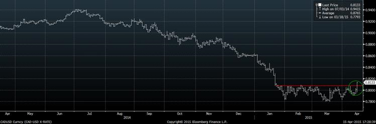 Le deuxième record historique de la journée : les inventaires de pétrole atteignent un nouveau sommet pour une 15ème semaine consécutive, à 483.7M de barils (graphique 3). Malgré ces inventaires massifs, l’accumulation fût moindre qu’anticipée ce qui a poussé le prix à la hausse de 5%, présentement à 56.40 $/baril à New York. Aussi, la semaine dernière, l’Arabie Saoudite avait augmenté son prix de vente à ses clients asiatiques, donnant un petit coup de pouce au prix de l’or noir, qui a par la suite poussé le dollar canadien. En effet, le dollar canadien a brisé sa résistance aujourd’hui faisant un nouveau haut depuis 12 semaines (graphique 4), principalement entrainé par la hausse du prix du pétrole. La Banque Centrale canadienne parlait ce matin, mais peu d’éléments nouveaux sortaient de cette conférence de presse, le taux directeur est maintenu à 0.75%.