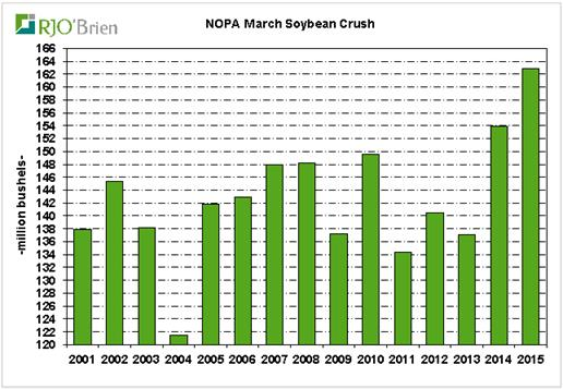 - NOPA: trituration de soya record en mars à 162.8M boisseaux, au-dessus des estimés