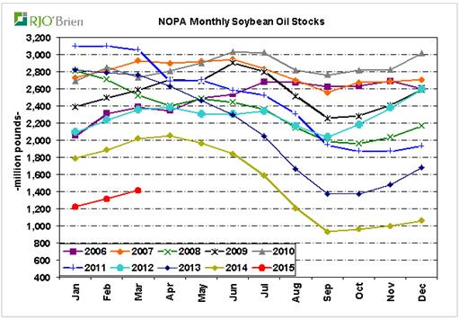 Grosse journée du côté des matières premières, beaucoup de mouvement au cours de la séance d’aujourd’hui. À midi, c’était le rapport mensuelle des triturateurs de soya américains, représentant environ 95% des opérations totales aux États-Unis. En mars dernier, il s’est utilisé 162.8M boisseaux de fève (tableau 1) pour la production de tourteau et d’huile, soit 4.8% de plus que la moyenne des estimés. C’est le plus gros volume historique de soya consommé pour la trituration en mars (graphique 1), dépassant largement les années précédentes ce qui devrait amener plus de tourteau et d’huile sur les marchés. Notamment, les inventaires d’huile ont augmenté plus qu’anticipés maintenant à 1.42 milliard de livres (graphique 2), bien en-dessous des années précédentes. Rappelons-nous que l’offre de fève était extrêmement faible l’été dernier ce qui a causé un ralentissement des opérations de trituration et pendant cette période, les inventaires d’huile ont sévèrement baissé, nous sommes donc en train de reconstruire ces réserves.