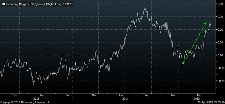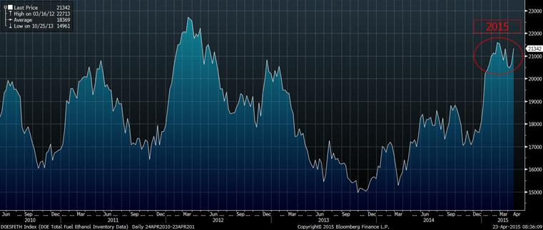 Depuis déjà quelques semaines, la production d’éthanol a considérablement ralenti pour atteindre 930 000 barils/jour la semaine dernière. Cette quantité est plus faible que la production hebdomadaire minimale pour atteindre la cible de l’USDA, soit 953 000 barils par jour. Cependant, la marge opérationnelle de fabriquer de l’éthanol a augmenté ces dernières semaines ce qui pourrait favoriser le volume produit prochainement, nous avons passé d’une marge de 5¢ le gallon à la fin mars à 23¢/gallon aujourd’hui (graphique 1). Malgré la faible production en avril, les inventaires continuent d’augmenter, avec un ajout de 697 000 barils la semaine dernière, totalisant 21.3M barils (graphique 2). Depuis le début 2015, la valeur des RINs (Ethanol Renewable Identification Numbers) pour l’année en cours demeure élevé à plus de 0.70$US par gallon puisque le prix de l’éthanol est relativement élevé versus le prix de la gazoline. Le prix des RINs pour 2015 ont atteint un sommet au début janvier à 0.85$US/gallon lorsque le prix du bio-carburant était plus élevé que celui de la gazoline.