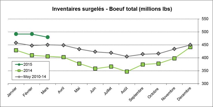 · Inventaires surgelés – Bœuf : hausse de 18% comparativement à 2014