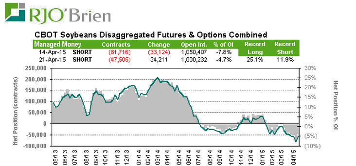 Les spéculateurs ont encore vendu des contrats de corn pour ainsi pousser leur net short à 65,298 contrats. Au même moment ou les specs vendent du maïs, l’open interest à baissé de près de 25,000 contrats c’est donc dire que les utilisateurs flairent la bonne affaire et s’empressent de prendre la contrepartie et ainsi acheter le stock nécessaire pour les prochains mois. Les spéculateurs ont un net short relativement élevé compte tenu que la saison ne fait que commencer. Quoi que pour l’instant la météo est favorable au semis, il sera intéressant de voir comment cette situation va se développer dans les prochaines semaines le vent tourne. À l’inverse les hedge funds ont acheté 34,211 CAT de soja pour ainsi réduire leur net short à 47,505. L’open interest à au même moment baissé de près de 50k CAT et on peut donc dire que les spéculateur ont peut-etre eu un role à jouer dans la récente hausse des prix.