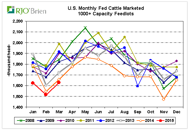 L’USDA nous donne l’information comme quoi les bœufs en parc d’engraissement sont à 100.1% vs 2014, les placement de mars à 100.4% vs 2014 et la commercialisation à 98.3% vs 2014. Essentiellement les placements et les bêtes en parc sont au même niveau qu’en 2014 et c’est beaucoup plus que le marché croyait. Les analystes s’attendaient à une baisse de 1 à 2% des bœufs en parc tandis qu’ils estimaient les placements en baisse de près de 7%. Au final le rapport sera percu comme négatif pour les prix puisqu’il y a plus de bœuf disponible que prévu, bien qu’il faudra à attendre la réouverture lundi pour constater la réaction du marché. Au niveau du marketing, là aussi, le rapport est négatif puisque selon les prévisions le mouvement de bœuf vers les abattoir a été plus faible en mars et indique que la demande n’a pas été aussi bonne que souhaitée. Une à une cent et demi de baisse à l’ouverture est un scénario plausible.Voir graphique et tableaux plus bas.