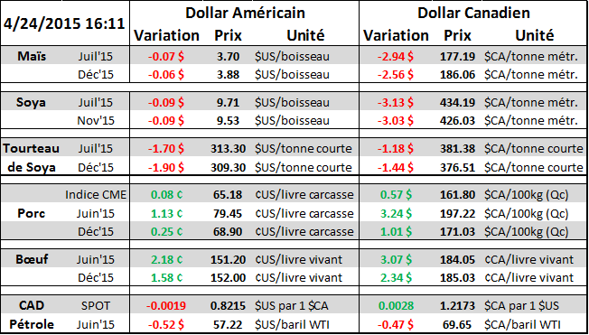 Pendant ce temps pour la semaine se terminant le 25 avril, il s’est abbatu 590,000 bœufs et 1,991,000 porcs. On parle d’ici d’une baisse de 7.8% vs 2014 pour la viande bovine tandis qu’on parle d’une augmentation de 9.7% pour le secteur porcin.