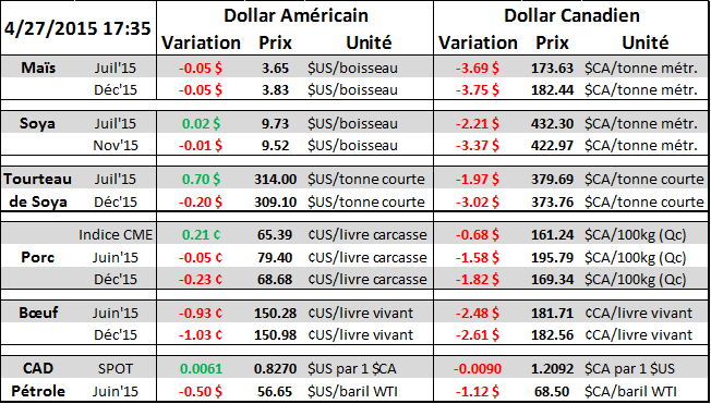Maintenant coté grain on peut parler d’un début de semaine difficile dans les prix du maïs. L’USDA (Export Inspections) nous donne des chiffres d’exportations solides avec près de 1.3 millions de tonnes métriques et c’était plus que prévu et même plus qu’il n’en faut pour suivre la cadence et respecter les estimés de 1.8 milliard de boisseaux fixé par le ministère de l’agriculture (voir tableau au bas). Ensuite nous avons aussi pu voir le dollar américain (dollar index) fléchir au cours de la séance. Deux facteurs qui auraient dû être positif pour le prix du grain mais rien n’a fait bouger les choses et au final le prix poursuit sa chute et nous avons dorénavant un board à 3.65 $/bu sur les futures de juillet. La météo s’annonce très clémente cette semaine et on estime maintenant qu’une bonne partie des semis seront dans la terre dès le début de mois de mai. (voir carte des précipitations plus bas).