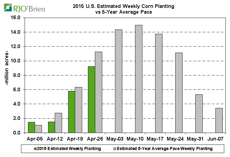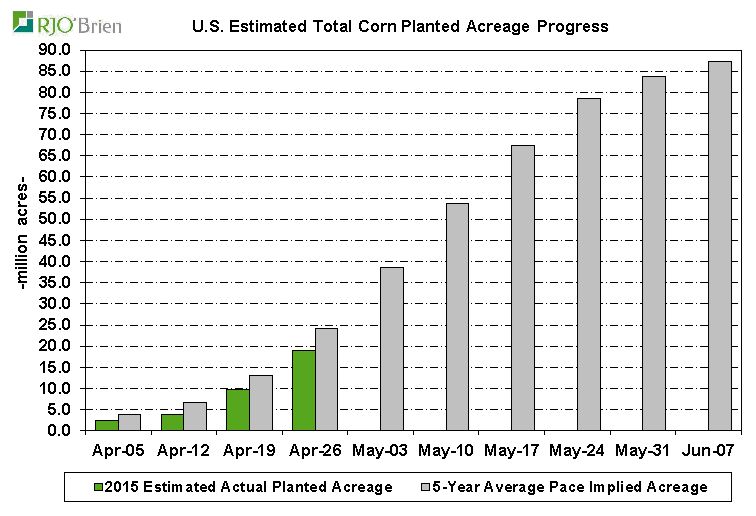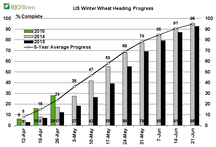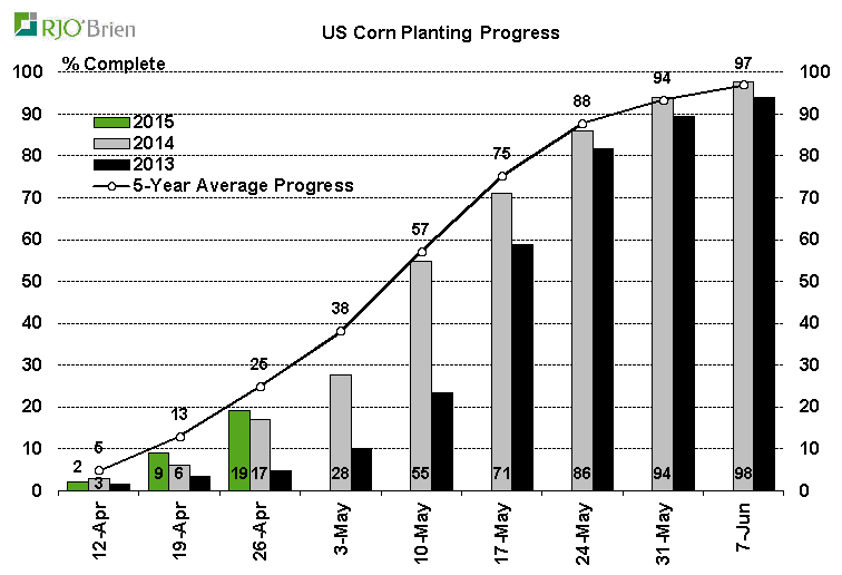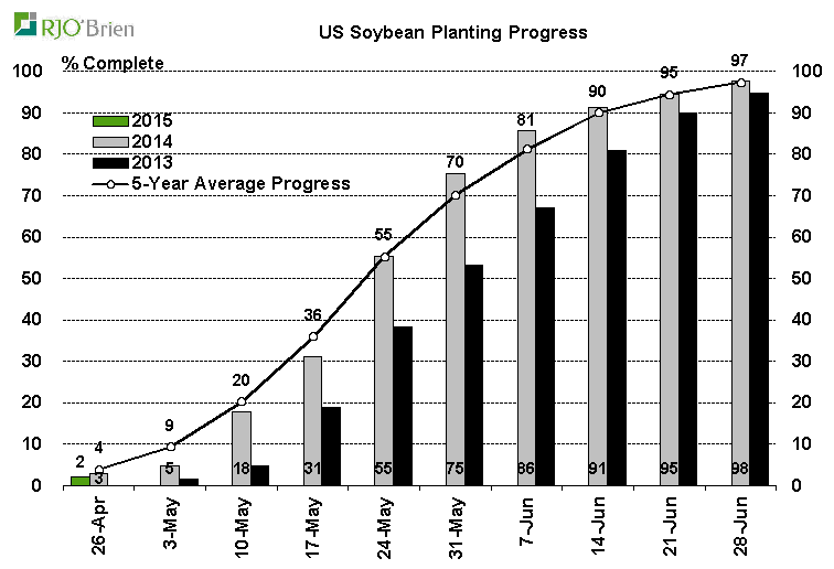 Voici pour la progression des semis. Toutes les données et proviennent de l’USDA et sont compilées par RJO pour l’aspect visuel d’un graphique.
