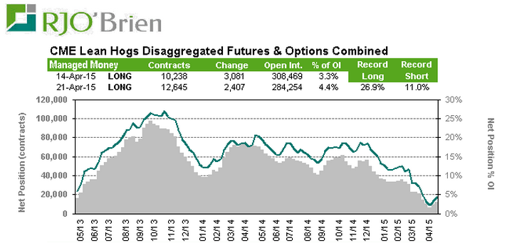 Le marché au comptant des prix du porc sont stable à légèrement positif à l’approche de la saison où habituellement le marché s’adapte à une plus petite offre et une meilleure demande (saisonnalité). On remarque qu’en ce moment les futures de juin jouissent d’une prime considérable par rapport au cash et cela laisse le marché vulnérable à une correction des contrats à terme si jamais l’augmentation de l’indice ne se fait pas aussi rapidement qu’espéré. Le CME Lean Hog Index à clôturé à 65.83 en date du 24 avril en hausse de 0.44 sur la journée. Dans ce scénario, juin à 80.125 bénéficie d’une prime assez importante pour cette période de l’année. Le marché étant par anticipation pure, il faudrait que le cash au 12 juin soit à 80.125. Côté spéculation nous assistons depuis quelques semaines à un regain des hedge funds sur les contrats de porc, quoique leur position nette longue de 12,645 contrat est loin d’influencer le marché d’autant plus que le nombre de contrat en cours (open interest) a chuté de 24,215 contrats sur la semaine (voir graphique plus bas). En d’autres mots, la récente hausse des prix n’a pas su attirer de nouveaux acheteur tant spéculatif que commerciaux. La valeur nationale de la découpe (http://www.ams.usda.gov/mnreports/lsddhps.pdf ) pour le 28 avril est à 66.91 et c’est la plus haute valeur depuis le 24 février.