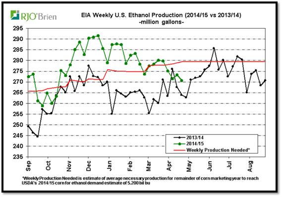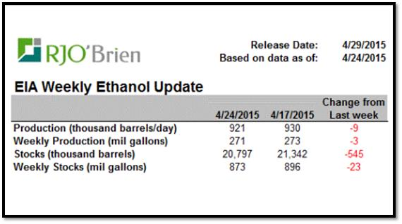 · Production d’éthanol à la baisse à 921,000 barils/jours, sous le niveau requis pour atteindre la cible de l’USDA