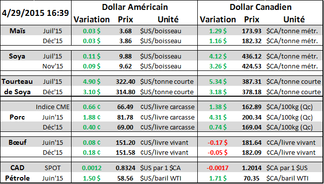 Du côté de la Chine, il y a eu des changements au niveau des subventions agricoles. Les producteurs de soya recevront moins d’argent et certains spécialistes chiffrent la baisse de la production chinoise de fève jusqu’à 20%, expliquant pour le prix de la fève reste stable ces derniers jours comparativement au reste des céréales qui sont plutôt faible. Dans le porc, la destruction du cheptel reproduction continue avec une diminution de 800 000 truies en février et 700 000 en mars pour un cheptel total de 40.4M de têtes (graphique 4). Il y a un peu plus d’un an, à la fin 2013, le cheptel reproducteur en Chine était de 50M de truies, nous parlons donc d’une baisse de 20% !! C’est alarmant lorsqu’on considère que la Chine produit la moitié du porc à l’échelle mondiale. Cette liquidation de 10M de truies en 16 mois, représente plus que 1.66 fois le cheptel de porc américain (6M têtes) . Pour la même période, on parle d’une baisse du cheptel commercial d’environ 16% à 387M têtes en mars 2015 comparativement à 465M à la fin 2013.