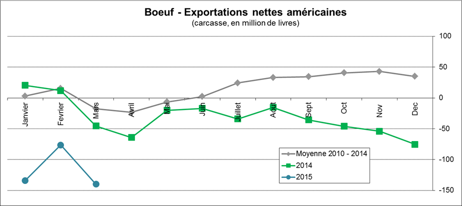 · En mars, les importations nettes de bœuf étaient de 140M lbs, un sommet depuis juillet 2007
