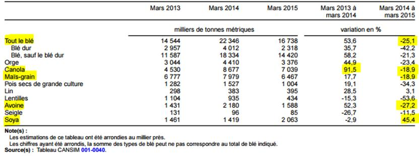 · Au 31 mars, les inventaires canadiens de céréales étaient de retour à la normale après d’énormes réserves en 2014 (à l’exception du soya)