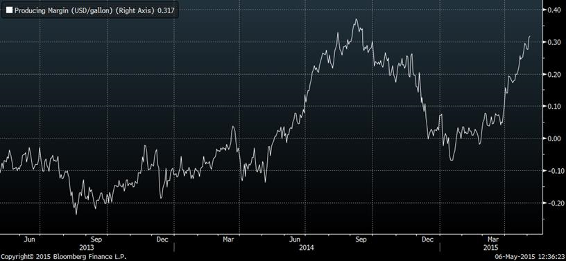 À 10h30 ce matin, le département américain de l’énergie publiait ses données de la semaine dernière où on note une diminution des inventaires de pétrole à 487M barils, une première depuis le 2 janvier 2015. Nous aurions donc touché un sommet historique la semaine dernière à 491M barils. Du côté de l’éthanol, les inventaires ont aussi baissé, de 35K barils, à 20.76 millions. Par contre, la production était très faible avec seulement 887K barils/jour (graphique 7), une grosse diminution depuis le début de l’année alors qu’on était presqu’à 1 million de barils produits par jour. Étonnamment, la production chute alors que la marge opérationnelle explose (graphique 8), de retour à plus de 0.30 $US/gallon, en raison de la remonté du prix du bio-carburant et de la baisse du prix du maïs.
